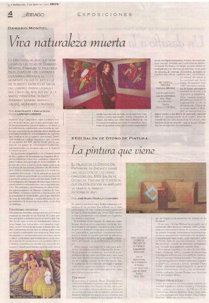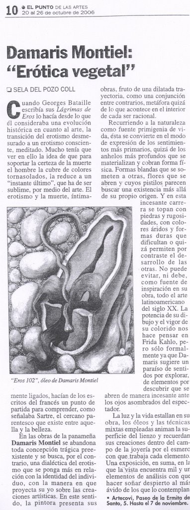 Exposición Homoconsumptor 2, Círculo de Arte de Toledo, Julio 2025. Telediario rtve Castilla la Mancha Julio 2025 prensa-critica-hoy-damaris-montiel-arte-obra-pintura-escultura-modaDescarga Entrevista Damaris Montiel Antena 3 Internacional 1994. Norte de Castilla, 2017 El Punto de las Artes 2006 El País Semanal